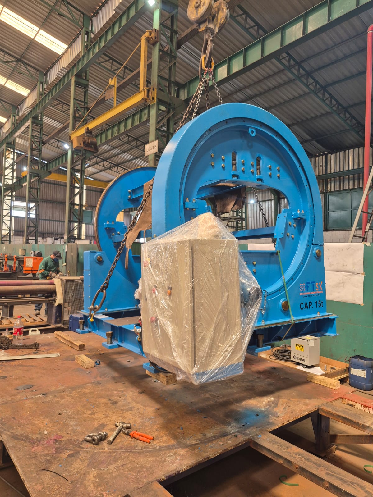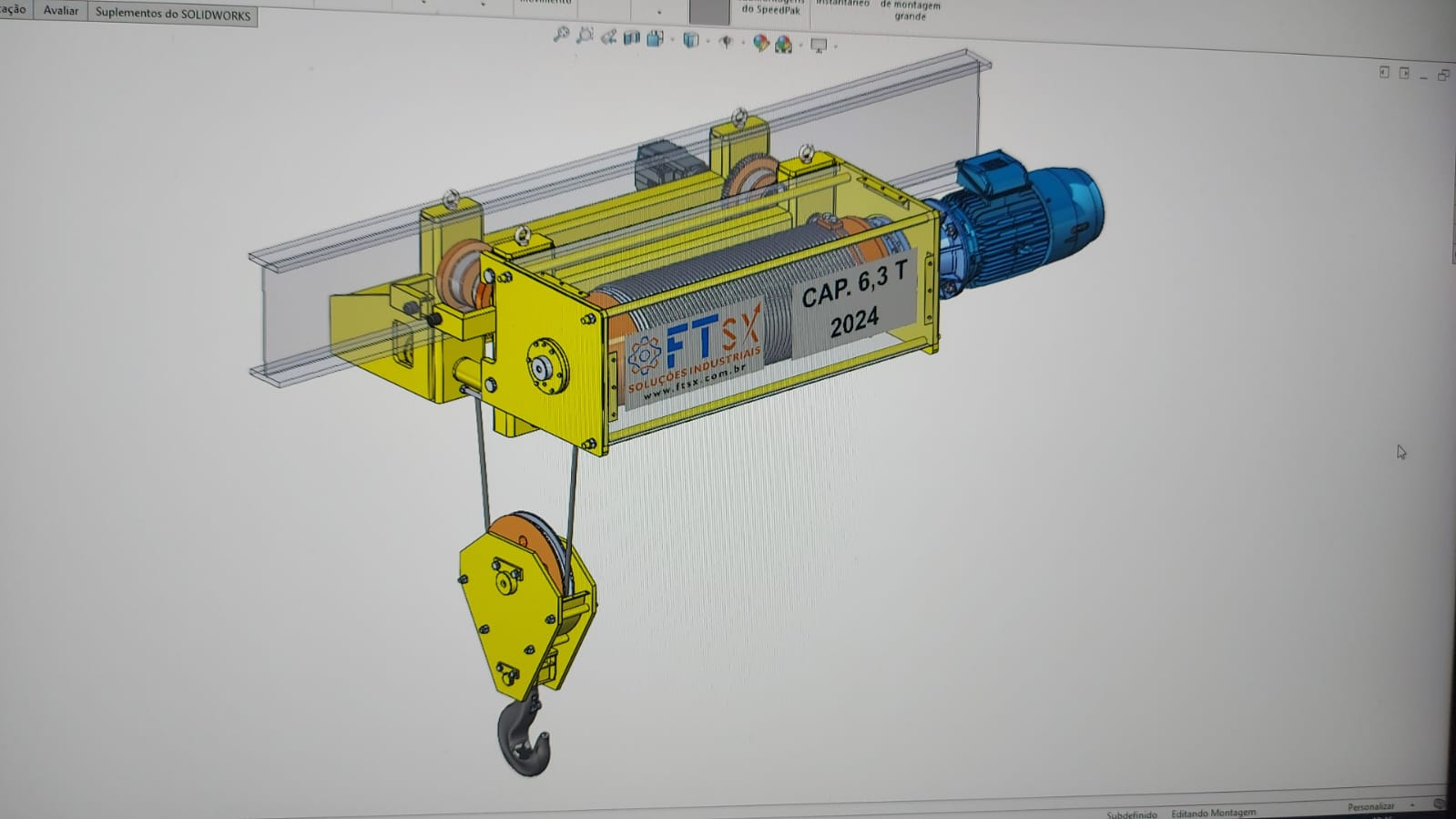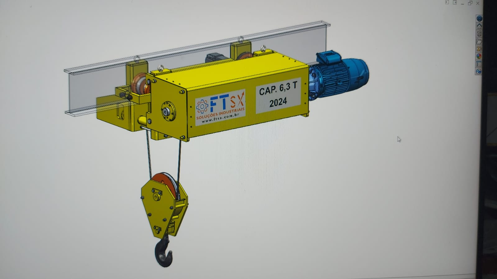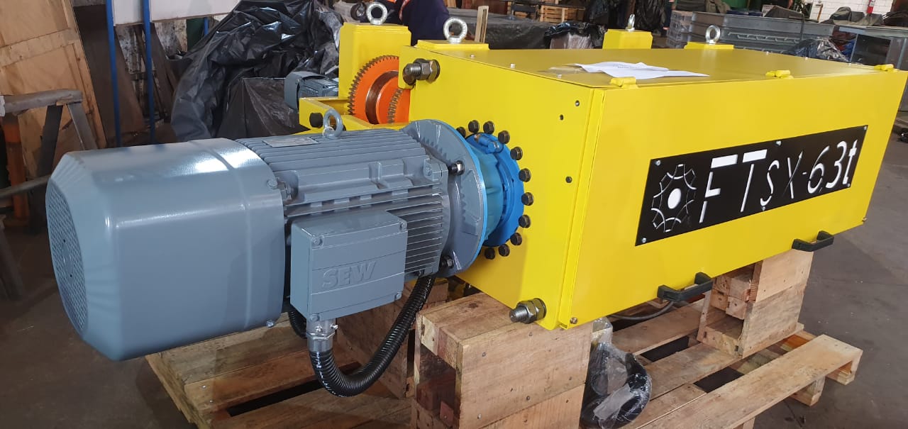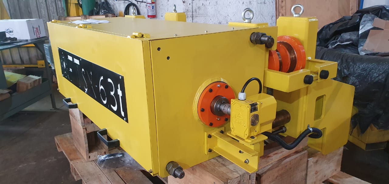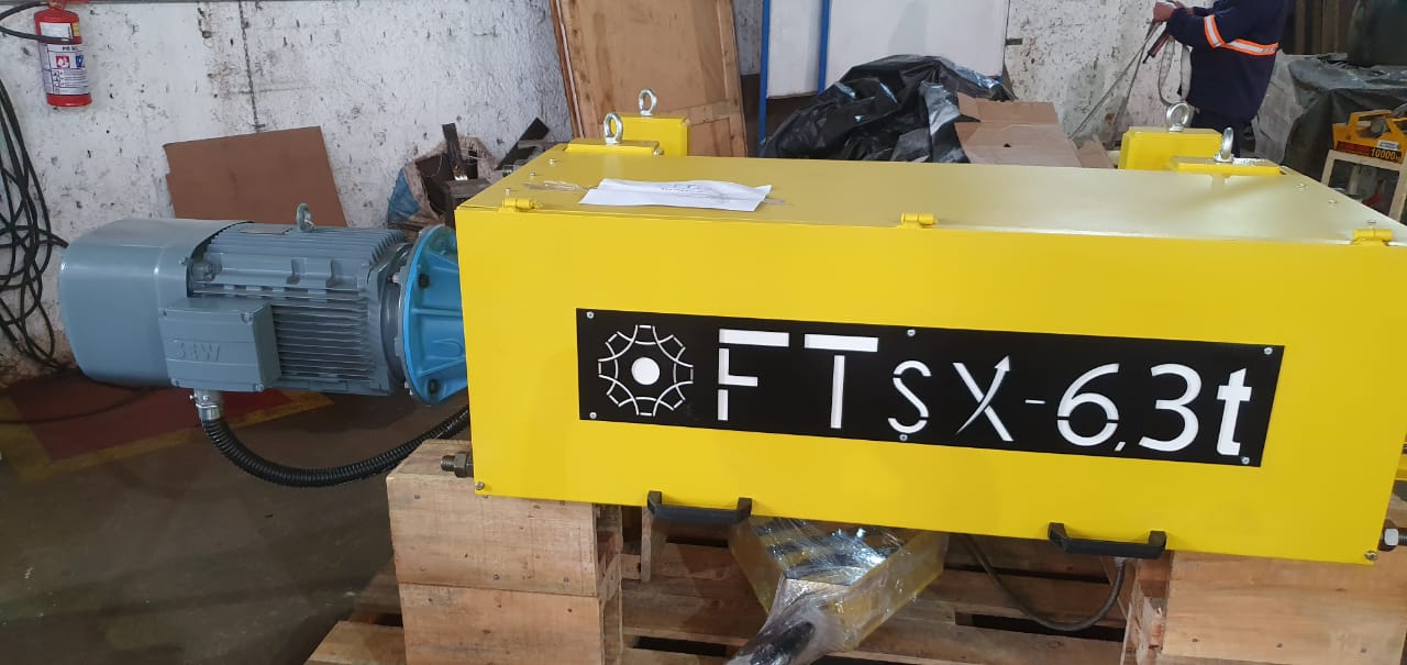 Projeto e Fabricação de Talha Elétrica, aplicado na aciária da usina siderúrgica, com capacidade de 6,3 t e altura de elevação de 30m, velocidade de elevação 12 m/min, conforme NBR 8400 M6 (3m), temperatura ambiente 60°C. Confiabilidade e Segurança para a Operação.